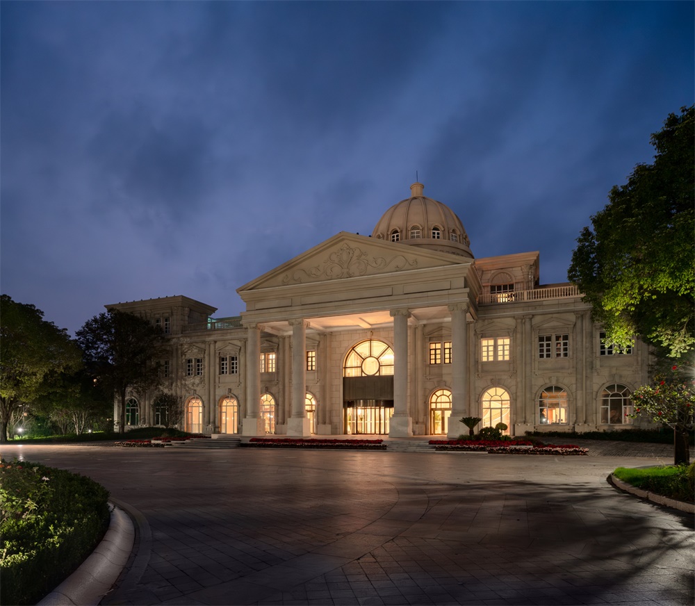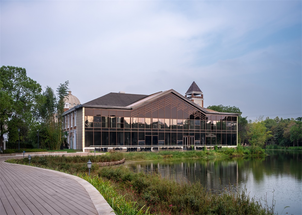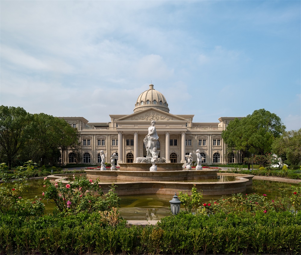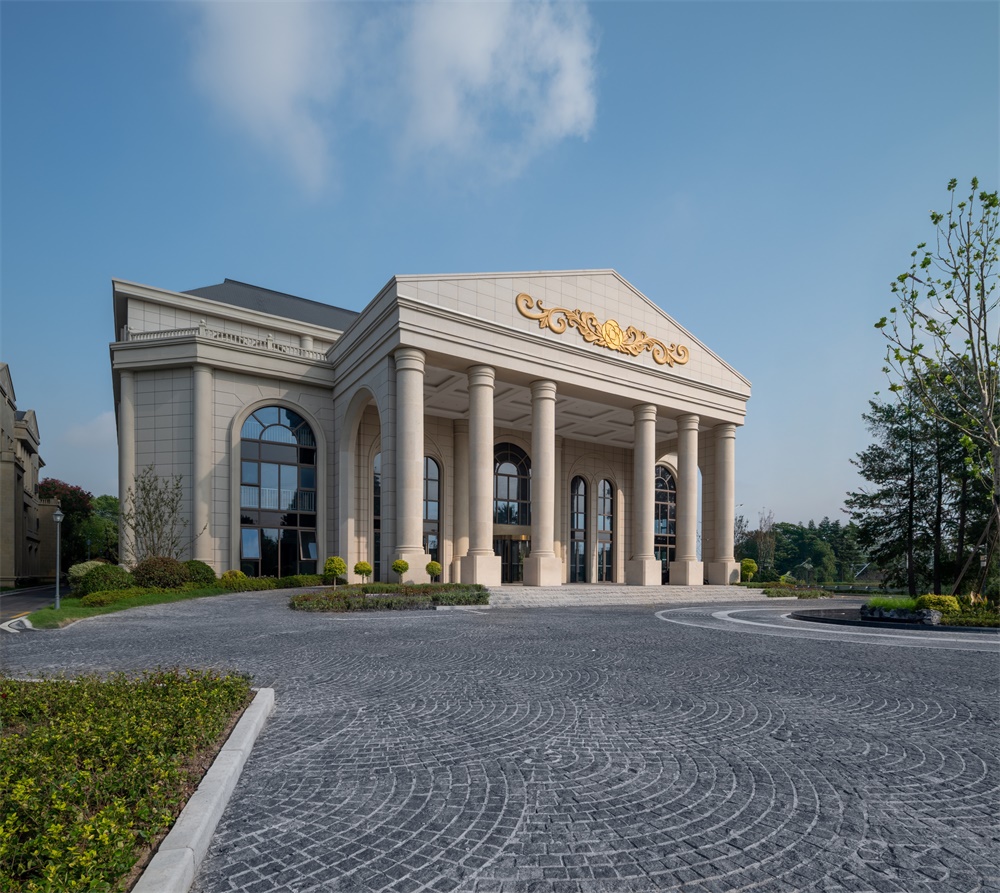 建筑以欧式与江南水墨风融合为核心,结合欧洲风情的穹顶、柱廊、拱门、玫瑰花窗等元素,营造浪漫的西式城堡氛围。注重形体变化与材料对比,石材、玻璃的比例变化,屋顶采用大角度坡面设计,增强空间层次感;通过其丰富的艺术细节、与自然结合的布局,营造出仪式感、故事性与沉浸式体验。