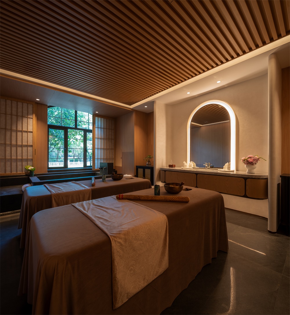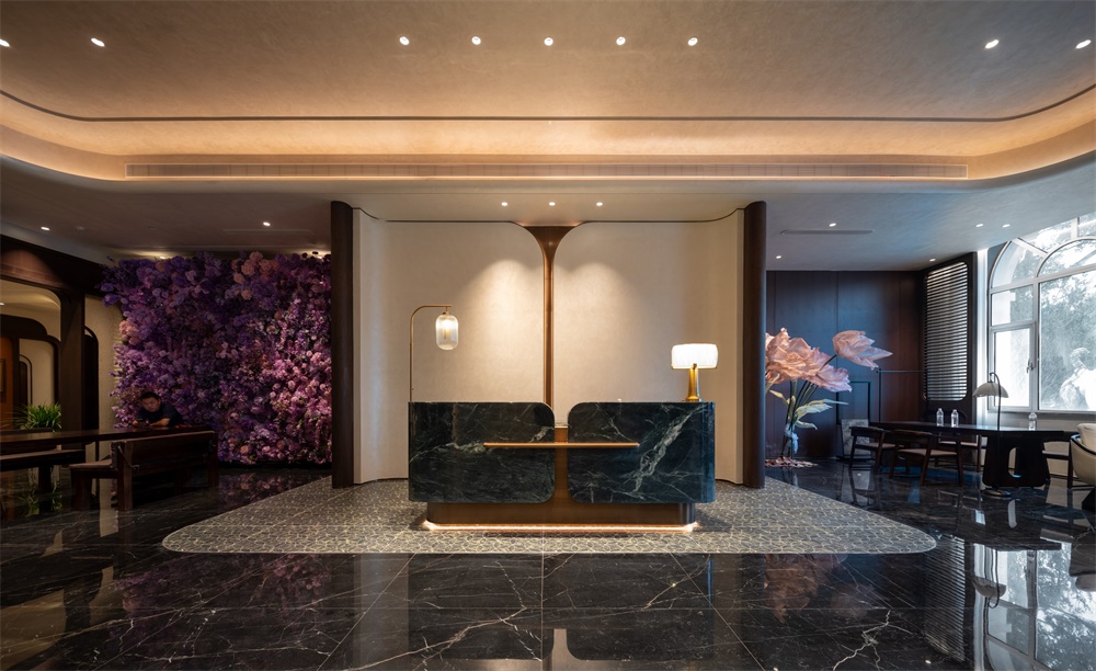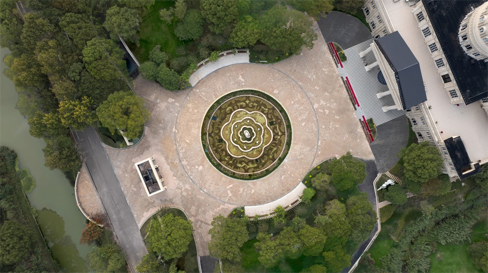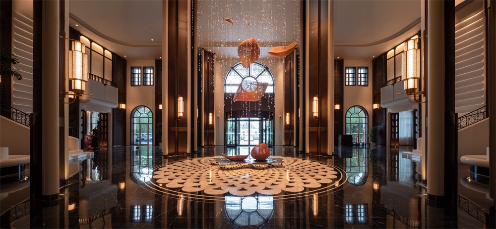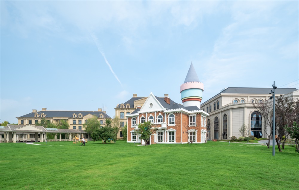 建筑以欧式与江南水墨风融合为核心,结合欧洲风情的穹顶、柱廊、拱门、玫瑰花窗等元素,营造浪漫的西式城堡氛围。注重形体变化与材料对比,石材、玻璃的比例变化,屋顶采用大角度坡面设计,增强空间层次感;通过其丰富的艺术细节、与自然结合的布局,营造出仪式感、故事性与沉浸式体验。